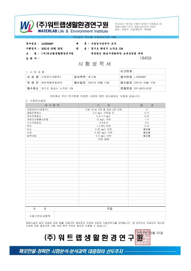 [스포츠] 2021년 3월 동탄복합문화센터 실내수영장 수질검사 성적서 작성자 관리자 작성일 2021년 3월 30일 9시 20분 32초 조회 726 2021년 3월 동탄복합문화센터 수영장 수질 성적서.jpg [ Size : 295.54KB, Down : 558 ] 미리보기 다운로드 목록보기