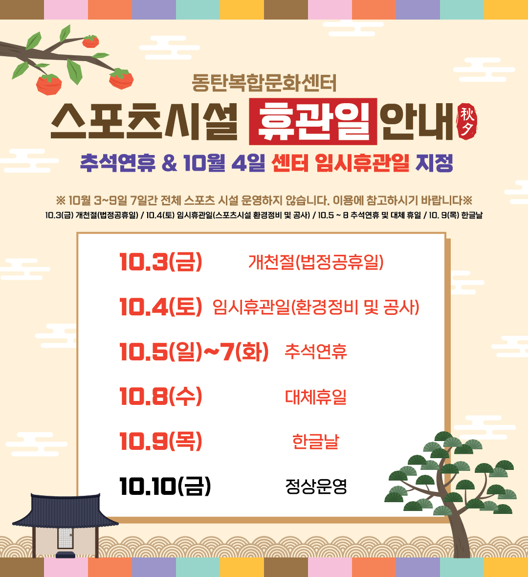- 10월 5일~8일 추석연휴 및 대체 휴일