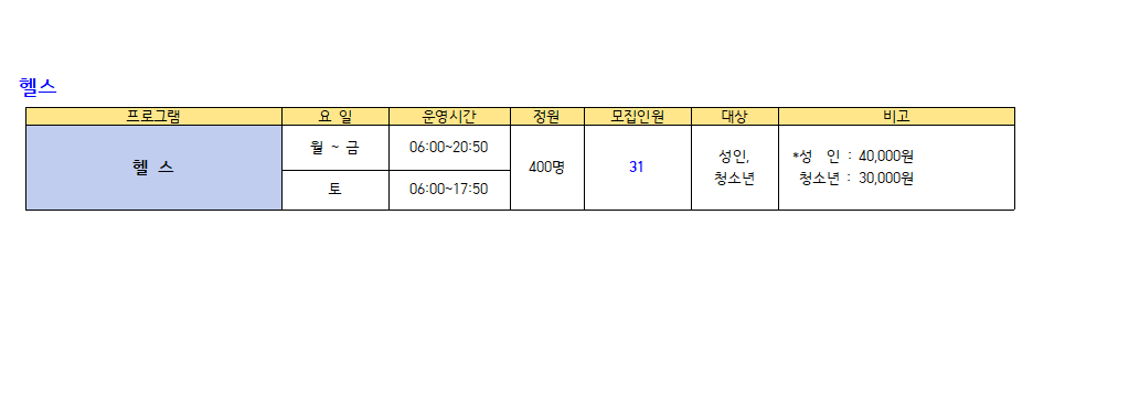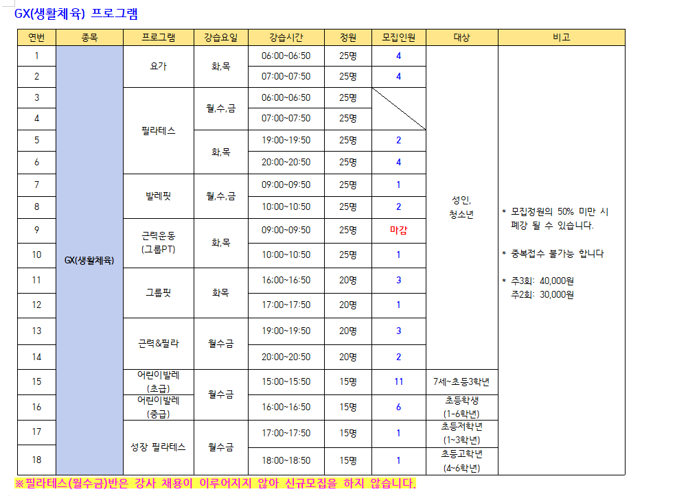 모집프로그램: 수영 프로그램, GX(생활체육), 헬스