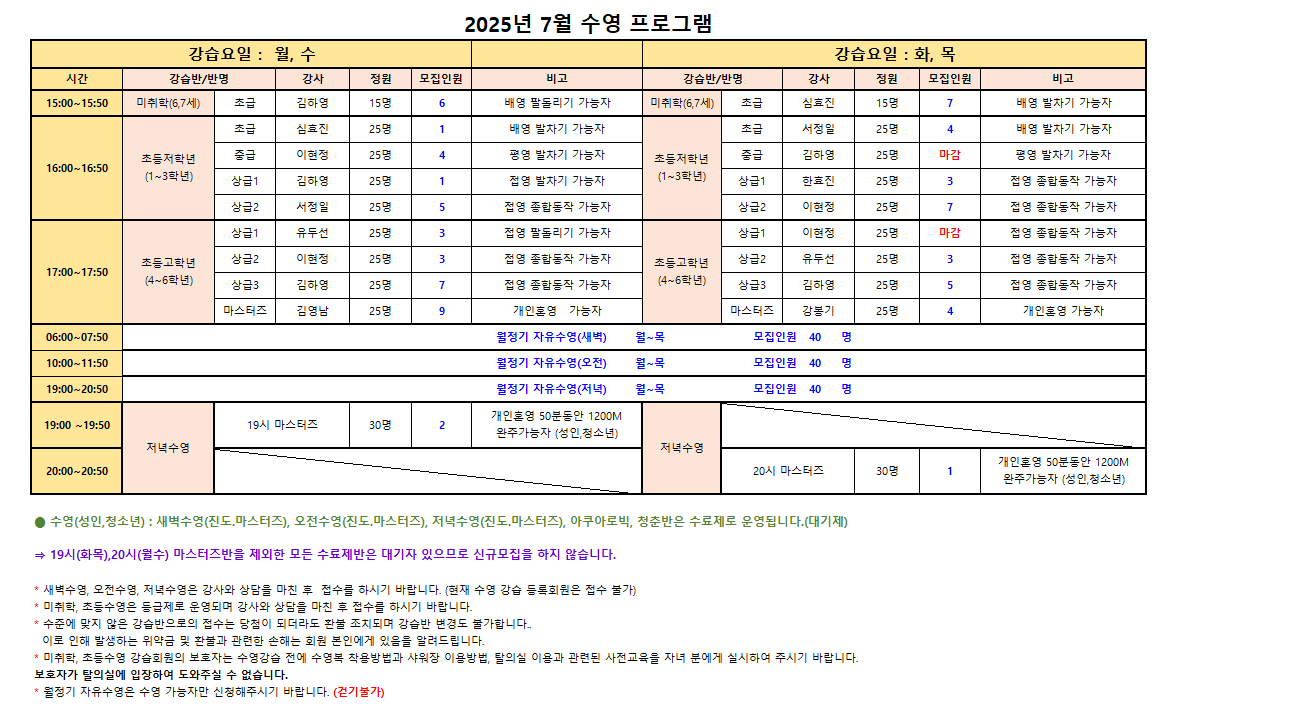 수영(성인,청소년) : 새벽수영(진도.마스터즈), 오전수영(진도.마스터즈), 저녁수영(진도.마스터즈), 아쿠아로빅, 청춘반은
