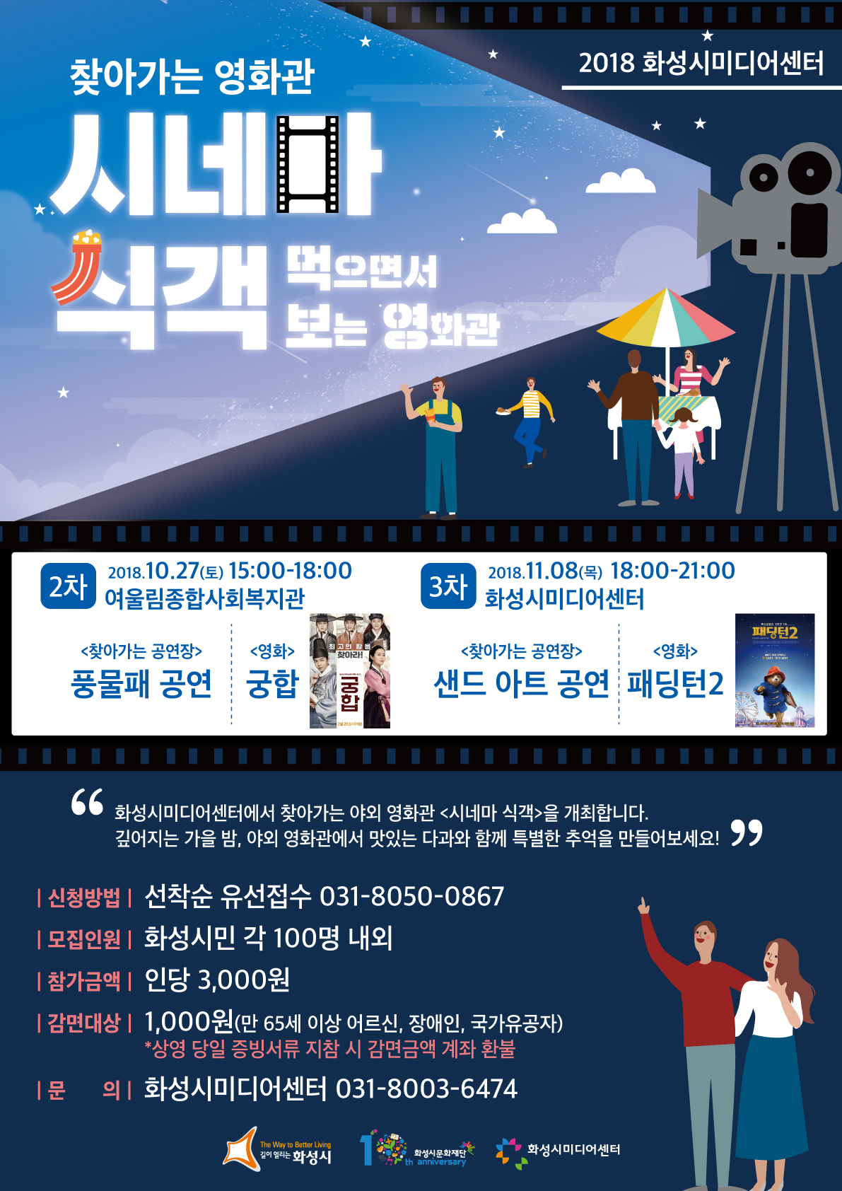 1. 찾아가는 영화관 '시네마 식객' 2차,장소: 여울림종합사회복지관 (경기도 화성시 송산면 사강로 145),기간:2018년 10월 27일~2018년 10월 27일