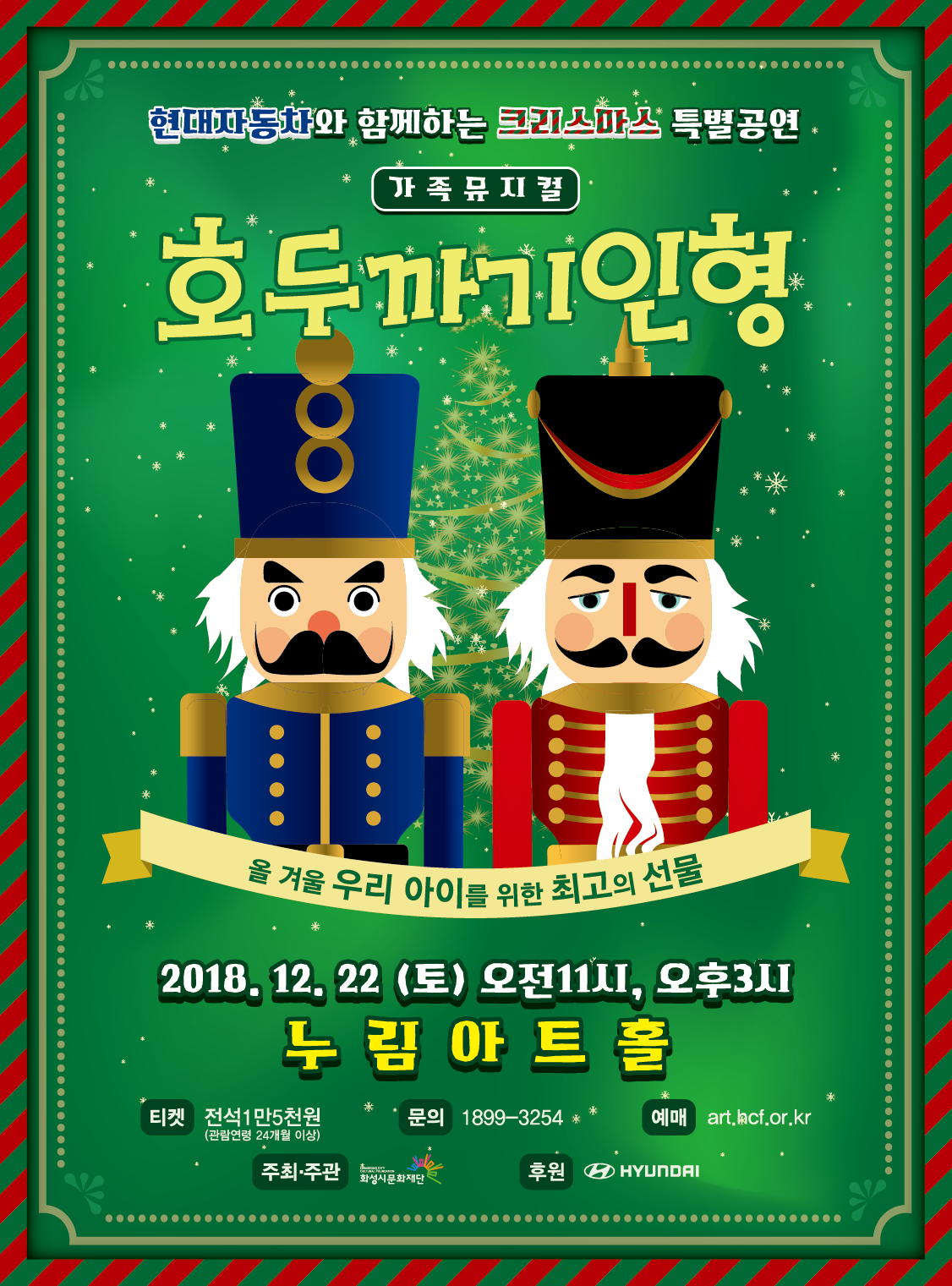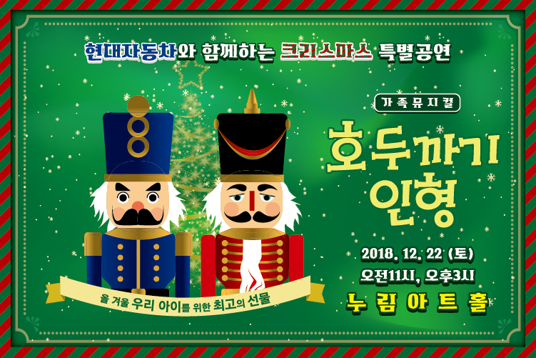 티켓오픈 11월 2일 (금) 오전 10시, 현대자동차와 함께하는 크리스마스 특별공연, 가족뮤지컬, 호두까기인형, 올 겨울 우리 아이를 위한 최고의 선물, 2018.12.22(토) 오전11시, 오후3시, 누림아트홀, 티켓 : 전석1만5천원(관람연령 24개월 이상), 문의 : 1899-3254, 예매 art.hcf.or.kr, 주최ㆍ주관 (재)화성시문화재단, 후원 HYUNDAI, 공연 소개, 가족 뮤지컬로 재탄생한 차이코프스키의 명작, 독일의 작가 E.T.A.호프만의 동화 <호두까기와 쥐의 임금님>을 원작으로 한 차이코프스키의 명작 발레극 <호두까기 인형>을 온가족이 함께 즐기는 가족 뮤지컬로 만나보자! <작은 서곡> <행진곡> <별사탕의 춤> <꽃의 왈츠> 등 차이코프스키의 감미로운 음악과 함께 11곡의 창작 뮤지컬 넘버와 배우들의 역동적인 연기가 더해져 뮤지컬의 재미를 up!up!, 1분 1초도 지루할 틈 없는 가족뮤지컬 <호두까기 인형>, 발레와 재즈, 아크로바틱으로 펼쳐지는 아름다운 안무!, 환상의 세계로 인도하는 스크린 영상!, 동화적 아름다움과 상상력을 자극하는 무대장치까지!,  줄거리, 눈이 많이 내리는 크리스마스 전날 밤... , 아버지와 어머니는 크리스마스 준비를 하시고 클라라와 프리츠는 설레이는 마음으로 창밖을 보며 드로셀 삼촌을 기다리고 있다. 마침내 기나긴 여행을 마치고 돌아온 드로셀 삼촌은 클라라와 프리츠에게 크리스마스 선물을 건넨다. 호두까지 인형을 받고 기뻐하던 클라라는 드로셀 삼촌에게 호두까기 인형에 대한 전설을 듣게 되고, 그날밤 클라라는 생쥐대왕과 그 일당들에게 괴롭힘을 당한다. 이 때 호두까기 인형이 나타나 장난감 병정들과 함께 클라라를 구하기 위해 생쥐대왕과 결투를 하게 되는데... 누림아트홀 오시는 길, 대중교통 이용시, 수원역, 오산, 동탄.병점.봉담 , 50번, 남양여객 : 031-296-8010, 시원운수 : 031-372-7306 , 자가용 인천, 서울, 수원, 오산, 주차안내, 주차장운영 : 06:00~22:00, 주차대수: 지상 149대, 지하2층 65대, 예매문의 1899-3254, 인터넷 예매 art.hcf.or.kr.png