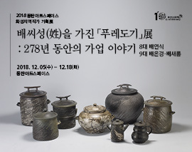 배씨성(姓)을 가진 '푸레도기' 展 : 278년 동안의 가업 이야기2018 동탄아트스페이스 화성지역작가 기획전 / 배씨성을 가진 푸레도기전:278년 동안의 가업이야기 8대 배연시 9대 배은경.배새롬 / 2018.12.05(수)~12.18(화) / 동탄아트스페이스