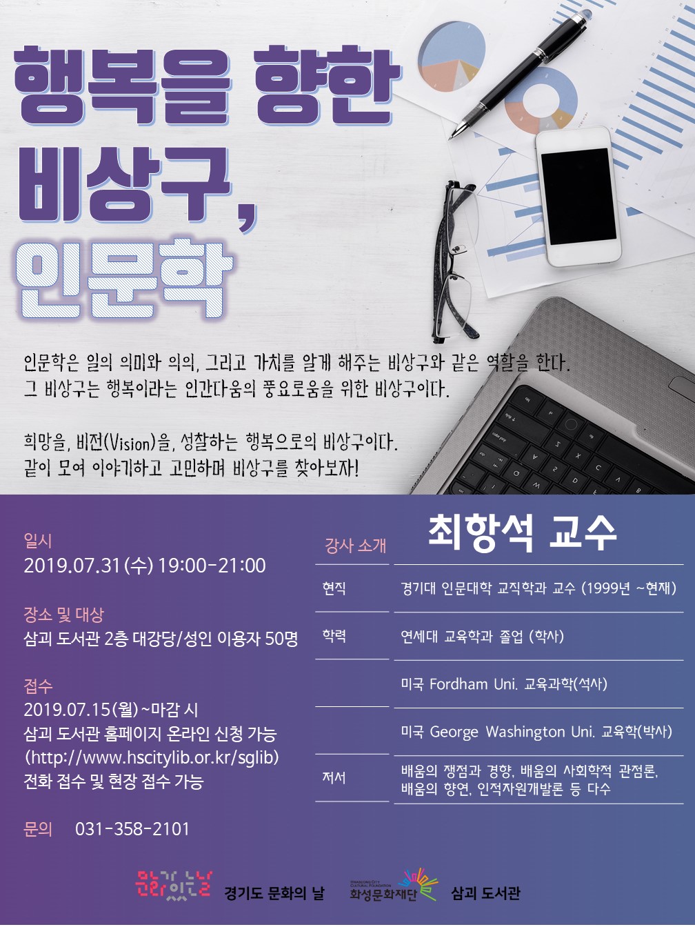 1. 행복을 향한 비상구, 인문학,장소:삼괴도서관 2층대강당,기간:2019년 7월 31일~2019년 7월 31일
