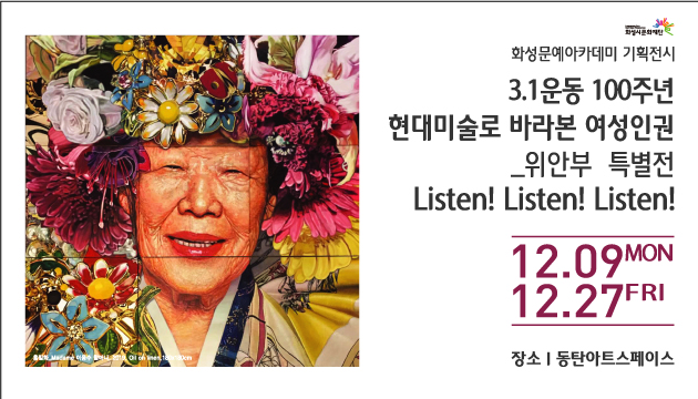 1.  [화성문예아카데미 기획전시] 3.1운동 100주년 현대미술로 바라본 여성인권_위안부 특별전,장소:동탄아트스페이스,기간:2019년 12월 7일~2019년 12월 27일