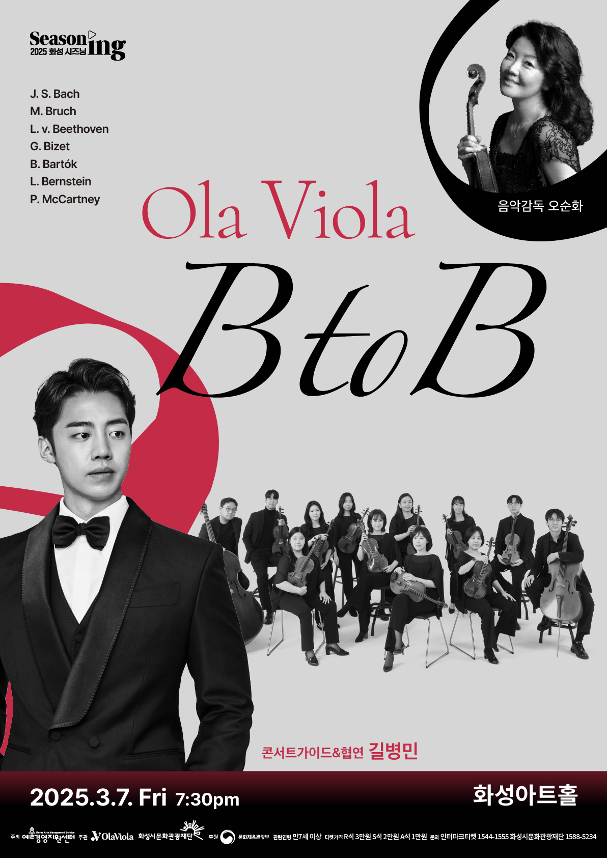 첫 무대는 바흐의 정교한 이탈리안 협주곡과 브루흐의 감미로운 로망스로 시작해, 베토벤의 상징적 테마와 길병민의 깊은 음색이 돋보이는 Ich liebe dich와 비제의 오페라 카르멘으로 이어진다. 2부에서는 민속적 아름다움이 담긴 바르톡의 루마니안 댄스와 번스타인의 웨스트 사이드 스토리 메들리를 통해 브로드웨이의 화려함과 비올라의 독창적인 매력을 선사 할 예정이다. 마지막으로 비틀즈 메들리와 비제의 카르멘 모음곡이 이우러져 고전과 현대의 클래식 선율들을 통해 관객들에게 감독을 주고자 한다.