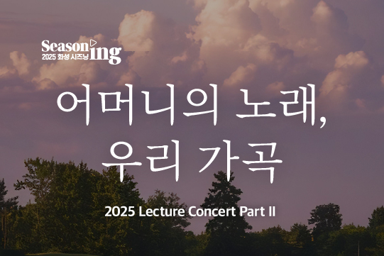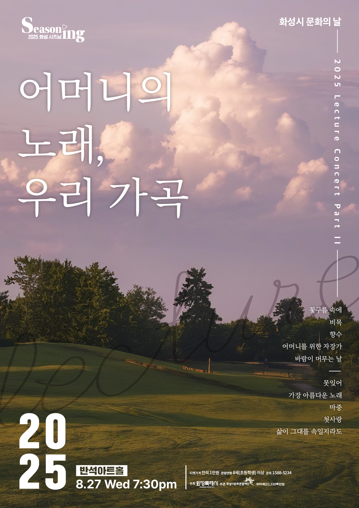 Seasoning 2025 화성시즈닝 화성시 문화의 날 2025 lecture concert part II 어머니의 노래, 우리 가곡 2025 반석아트홀 8.27 Wed 7:30pm 티켓가격 전석 1만원 관람연령 8세(초등학생) 이상 문의 1588-5234 주최 화성특례시 주관 화성시문화관광재단 위탁예산 2330백만원