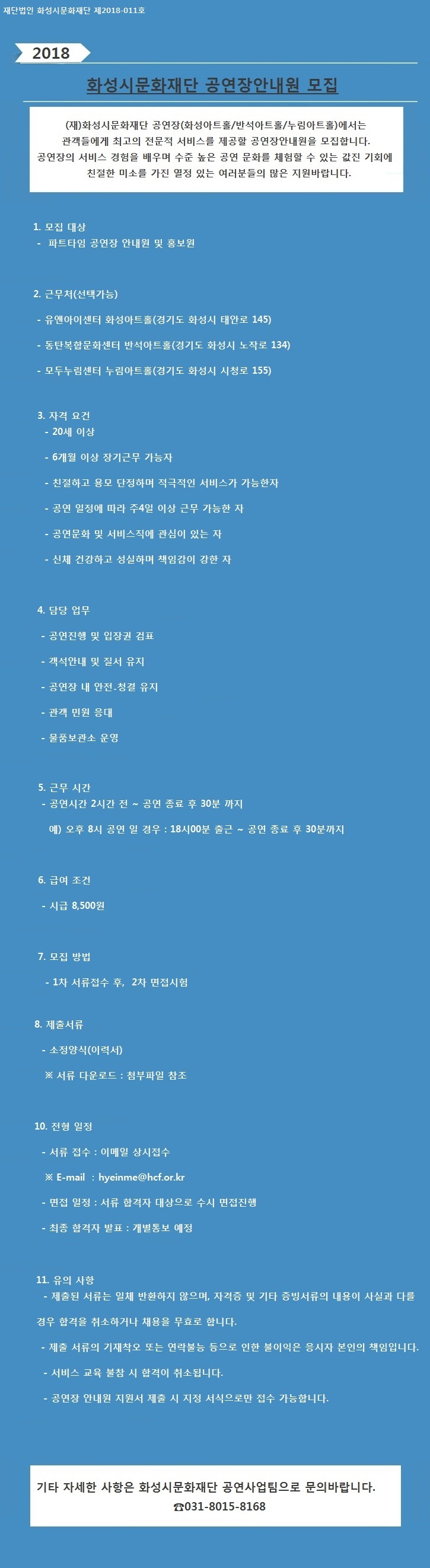 (재)화성시문화재단 공연장 안내원 모집 작성자 ADMIN 작성일 2018년 1월 8일 13시 23분 36초 조회 1,198 사본_-화성시문화재단_공연장안내원_모집.jpg [ Size : 270.59KB, Down : 236 ] 미리보기 다운로드 공연장안내원_지원서양식.hwp [ Size : 17KB, Down : 737 ] 다운로드 목록보기