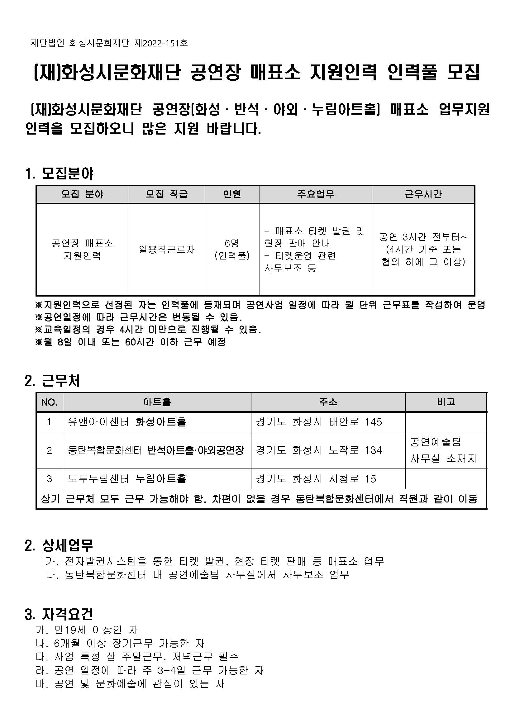 (재)화성시문화재단 공연장 매표소 지원인력 모집공고(2022년)_페이지_1 -