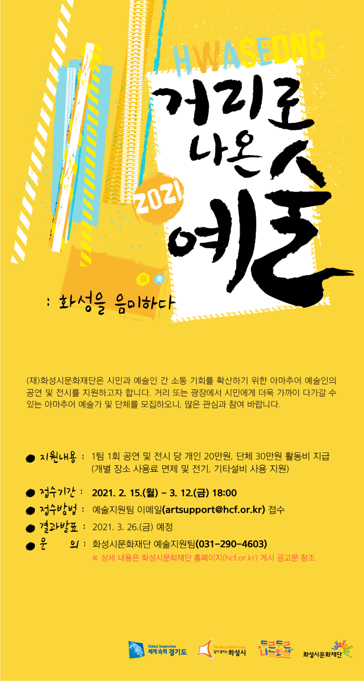 거리로 나온 예술 화성을 음미하다, 화성시문화재단은 시민과 예술인 간 소통 기회를 확산하기 위한 아마추어 예술인의 공연 및 전시를 지원하고자 합니다. 거리 또는 광장에서 시민에게 더욱 가까이 다가갈 수 있는 아마추어 예술가 및 단체를 모집하오니 많은 관심과 참여 바랍니다. 지원내용, 1팀 1회 공연 및 전시 당 개인 20만원, 단체 30만원 활동비 지급, 개별 장소 사용료 면제 및 전기, 기타설비 사용 지원, 접수기간 2021.02.15(금).~3.12.(금) 18:00, 접수방법, 예술지원팀 이메일 artsupport@hcf.or.kr 접수, 결과발표 2021.03.26.(금) 예정, 문의 화성시문화재단 예술지원팀 031-290-4603, 상세내용은 화성시문화재단 홈페이지 게시 공고문 참조