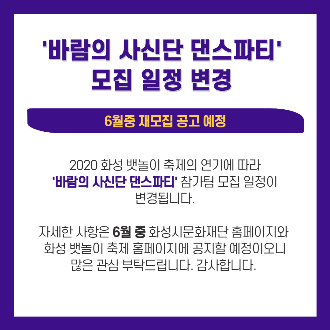 2020 화성뱃놀이 축제 <바람의 사신단> 모집 일정 6월 재공고 예정 안내 작성자 관리자 작성일 2020년 3월 24일 14시 15분 31초 조회 568 바람의 사신단 댄스파티 모집일정 변경.png [ Size : 131.62KB, Down : 346 ] 미리보기 다운로드 목록보기