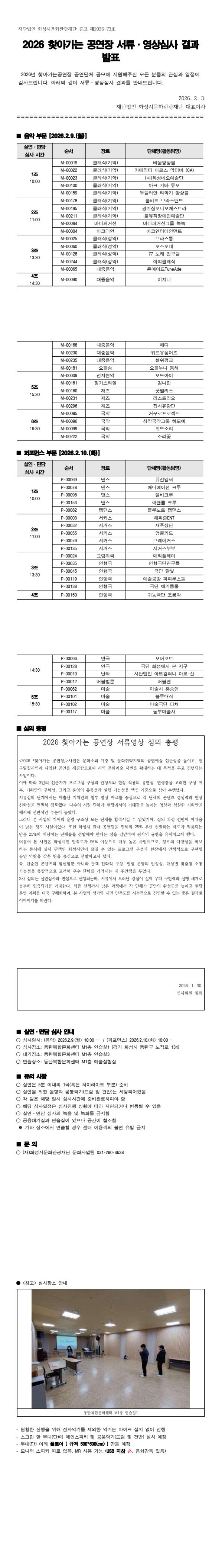 2026 찾아가는 공연장 공연단체 공모 서류영상 심사결과 공고 작성자 관리자 작성일 2026년 2월 3일 13시 14분 20초 조회 833 2026 찾아가는 공연장 서류영상 심사결과 공고문.jpg [ Size : 308.63KB, Down : 1,348 ] 미리보기 다운로드 2026 찾아가는 공연장 서류영상 심사결과 공고문 목록보기