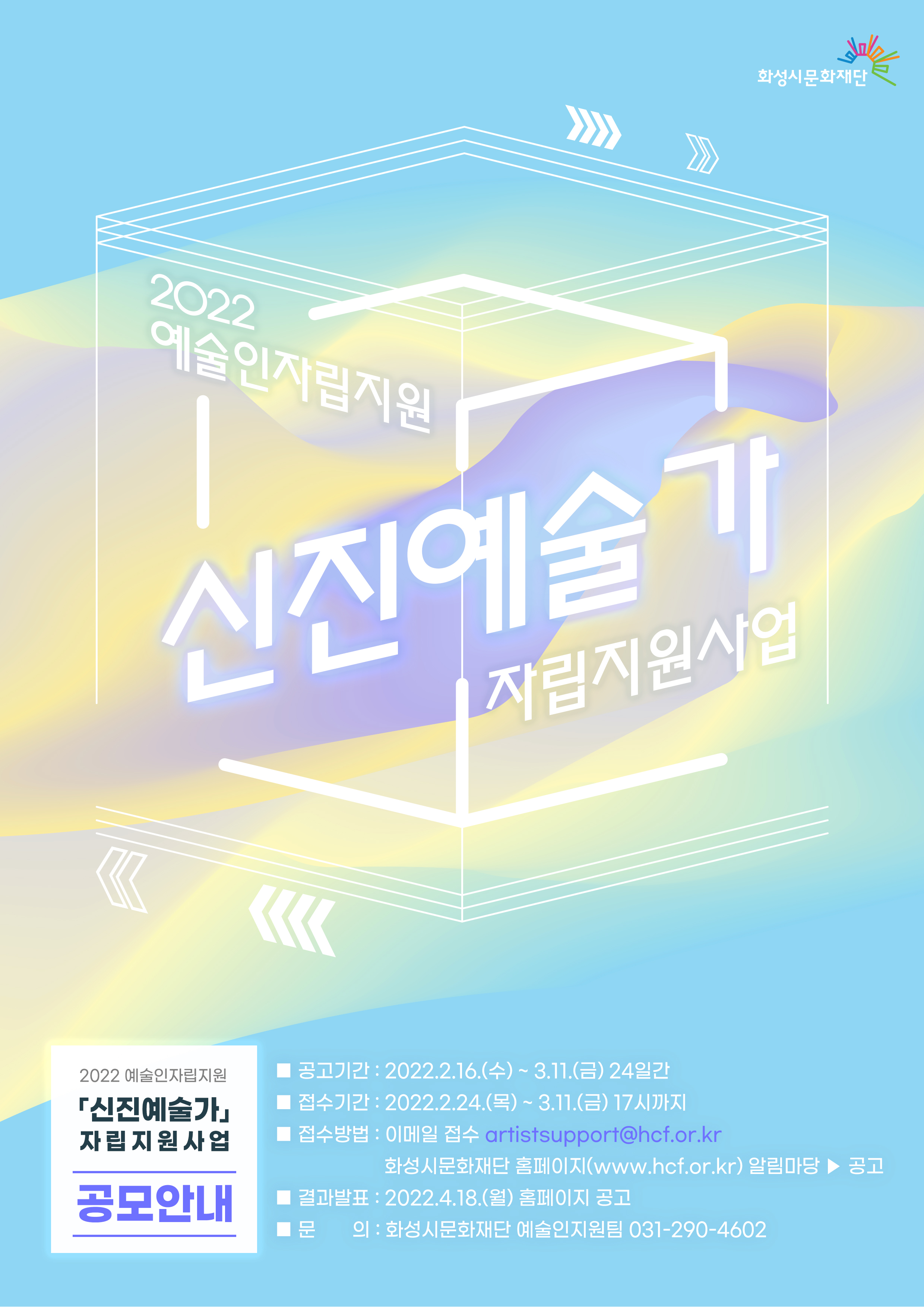 (재)화성시문화재단에서는 화성시 관내 신진 예술가 발굴을 위한 노력 및 지원의 일환으로 「신진 예술가 자립지원 사업」을 진행하고자 합니다. 화성시 관내 신진 예술인의 예술 활동 시작 및 지속을 위한 기반을 마련하고, 지속적인 예술 활동을 도모하기 위한 본 사업에 관내 신진 예술인 여러분의 많은 참여 바랍니다. 2022. 2. 16. (재)화성시문화재단 대표이사 |