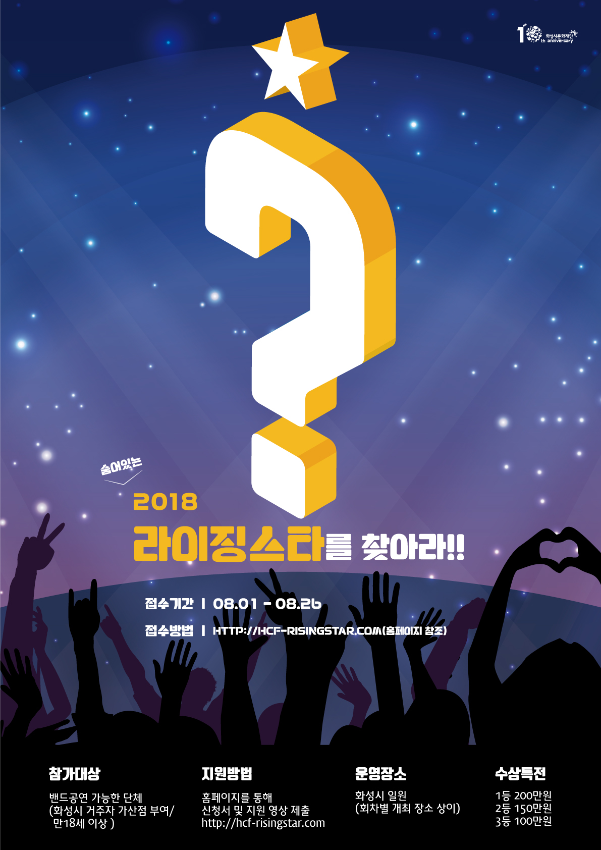 (재)화성시문화재단(대표이사 권영후)이 다가오는 가을, 시민 예술가를 발굴하고 일상 생활 속 개인의 문화예술 활동을 지원하기 위한 밴드 경연대회 <2018 라이징스타를 찾아라>를 개최한다.
