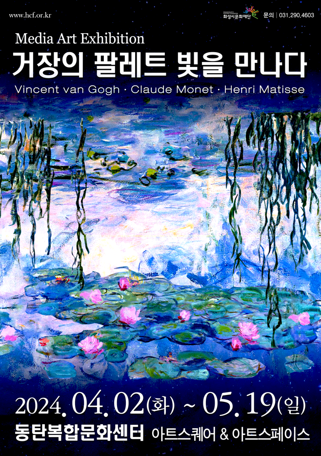(재)화성시문화재단에서 가정의 달을 맞아 서양미술사에서 가장 위대한 화가로 사랑받는 세 명의 거장, 반 고흐, 모네, 마티스의 작품을 미디어 아트로 만나볼 수 있는 <거장의 팔레트 빛을 만나다>를 개최한다.