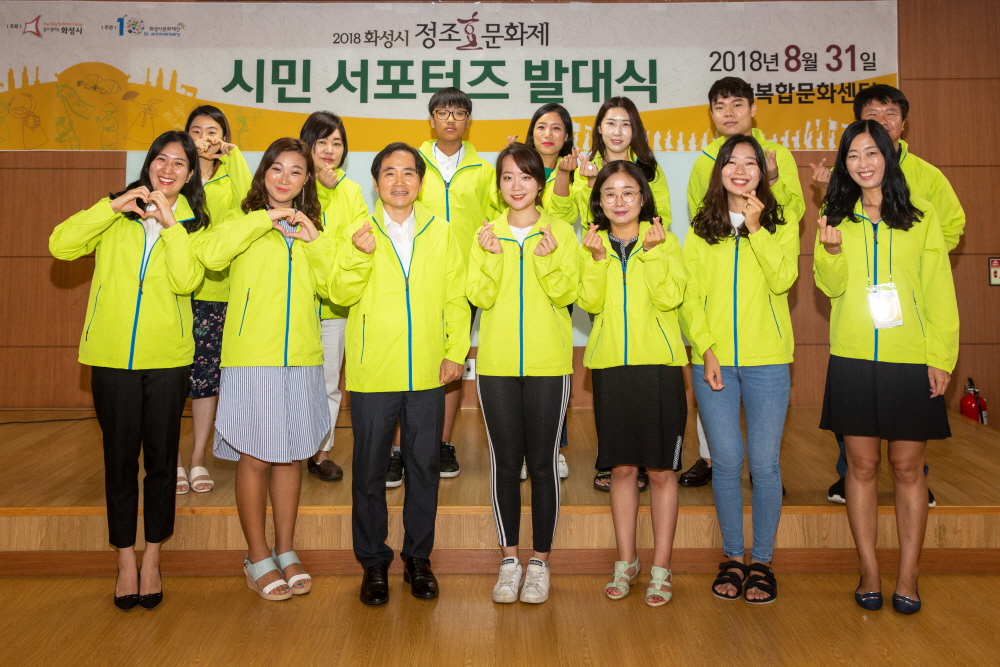 ‘2018 정조 효 문화제’ 시민 서포터즈 발대식이 오늘 8월 31일(금) 동탄복합문화센터에서 열렸다. 발대식에는 화성시 및 화성시문화재단 축제관계자들이 참석한 가운데 시민 서포터즈 20명에 대한 위촉장 수여, 축제 소개, 서포터즈 활동 교육 순으로 진행되었다.