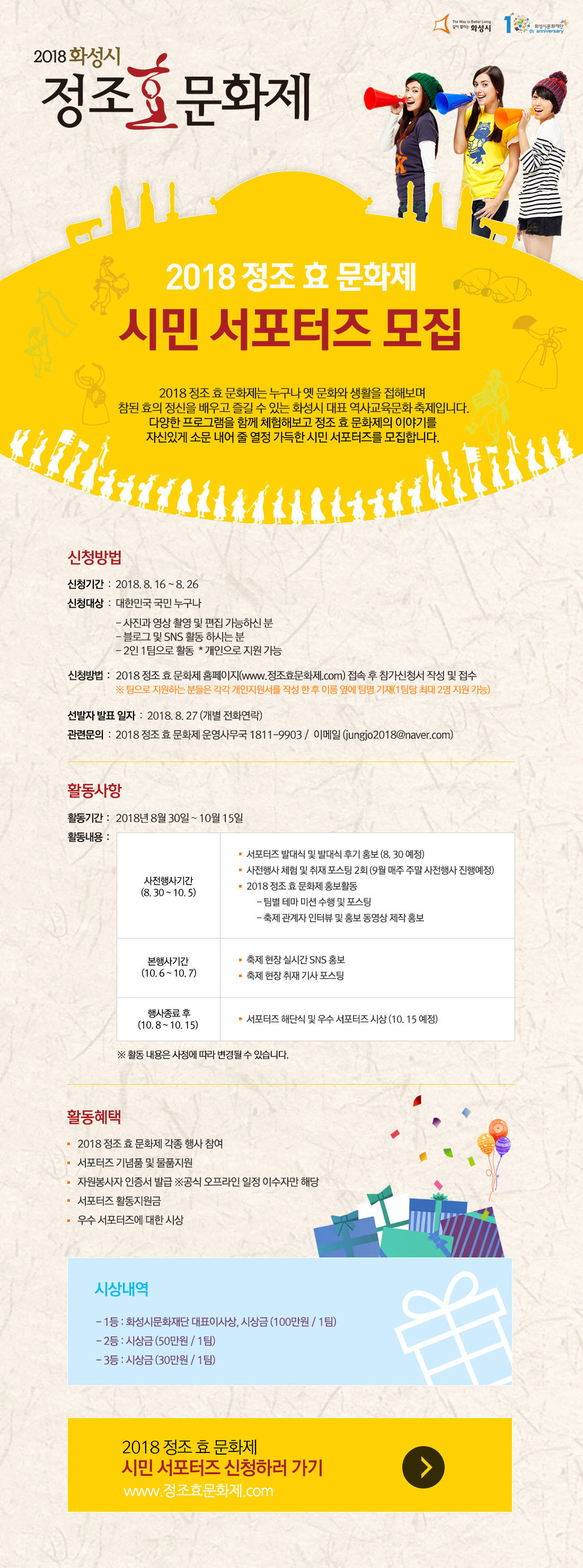 <2018 정조 효 문화제> 시민 서포터즈로 선정 되면 8월 30일부터 10월 중순까지 2인 1팀으로 공식 서포터즈로 활동할 예정이다. 선정된 시민 서포터즈는 정조대왕의 관련된 정보를 각자의 시선에서 담은 새로운 컨텐츠를 제작 후 SNS에 공유하는 역할을 수행한다. 아울러 전원에게 소정의 활동비가 지원되며, 활동 종료 후에는 수료증이 수여된다. 최종 우수 서포터즈 1등 팀에게는 화성시문화재단 대표이사상과 시상금 100만원(1팀), 2등 50만원(1팀), 3등 30만원(1팀)을 수여한다.