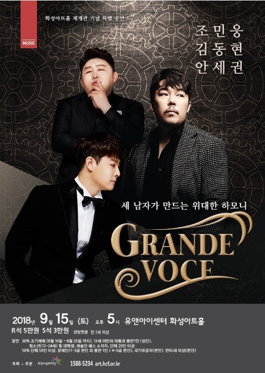 (재)화성시문화재단(대표이사 권영후)이 리모델링을 마친 화성아트홀의 재개관을 기념하며 특별 공연 시리즈를 선보인다. 그 첫 번째 공연으로 ‘팬텀싱어2’를 뜨겁게 달궜던 웅장한 목소리의 주인공 조민웅, 김동현, 안세권이 출연하는 <그란데 보체>를 9월 15일 토요일 화성아트홀에서 진행한다.