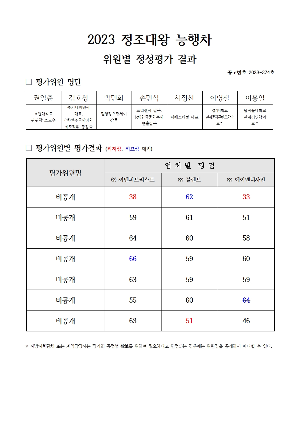 2023 정조대왕 능행차 공동재현 화성구간 대행용역 평가위원별 정성평가표