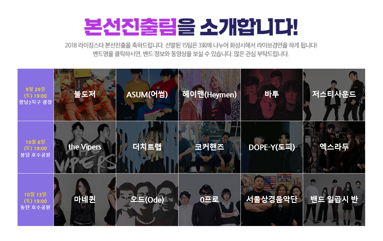 【[기 타] 행사】2018 라이징스타를 찾아라 본선 2차 장소 봉담 호수공원 기간 2018년 10월 6일 ~ 2018년 10월 6일 공연시간 오후 7시부터 티켓정보 관람등급 전체 문의 031-8015-8264 2018 라이징스타를 찾아라 본선 2차 10월6일 (토) 봉담호수공원 오후 7시 문화캘린더_라이징스타를-찾아라.png [ Size : 37.22KB, Down : 291 ] 미리보기 다운로드 final_poster.jpg [ Size : 871.04KB, Down : 312 ] 미리보기 다운로드 본선진출.PNG [ Size : 1.02MB, Down : 313 ] 미리보기 다운로드 목록보기