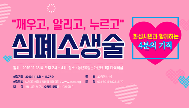 1. 화성시민과 함께 하는 심폐소생술(4분의 기적),장소:동탄복합문화센터 1층 다목적실,기간:2019년 11월 28일~2019년 11월 28일