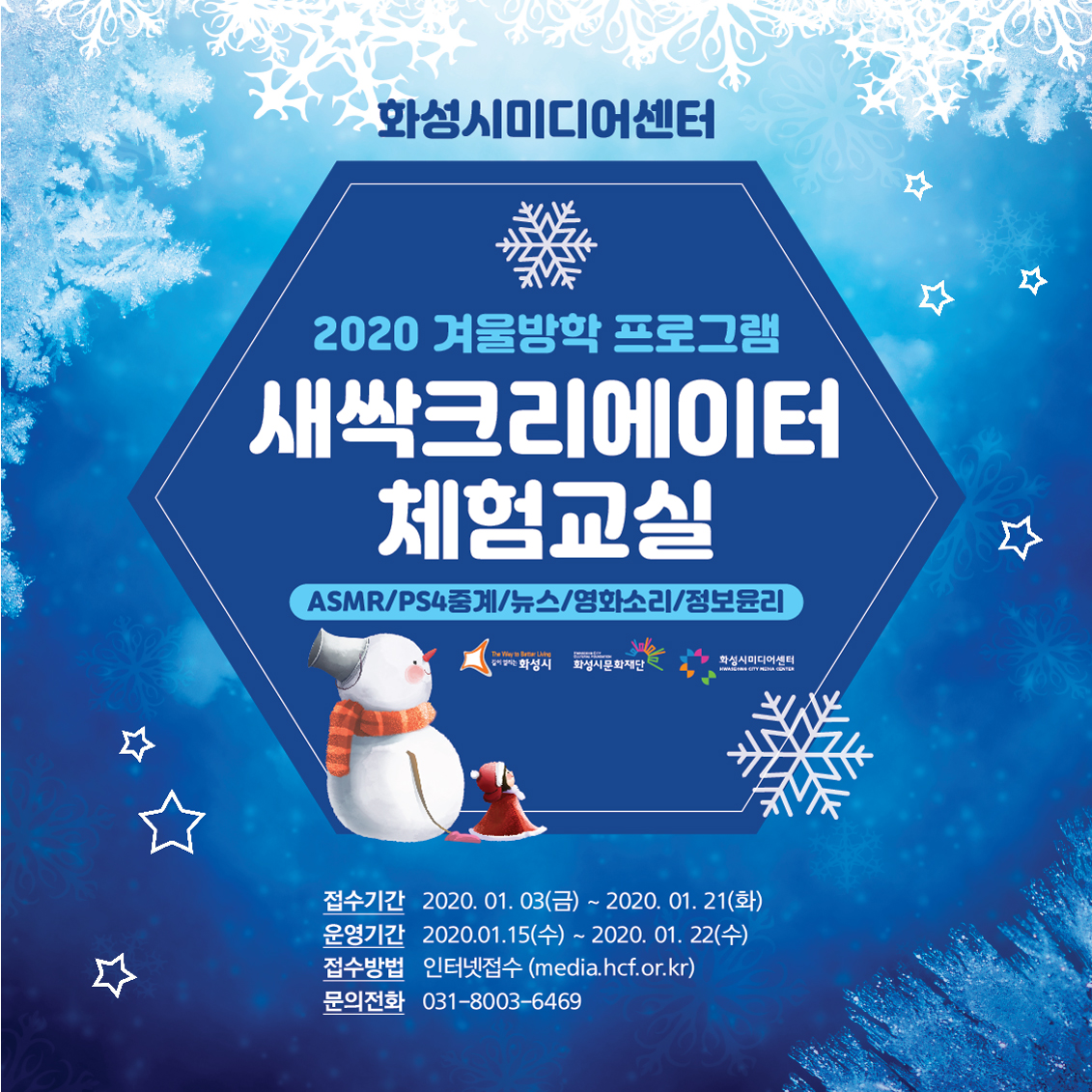 【[기 타] 행사】2020 겨울방학프로그램_새싹크리에이터 체험교실 장소 화성시미디어센터 기간 2020년 1월 15일 ~ 2020년 1월 22일 공연시간 티켓정보 관람등급 초1-중3 문의 031-8003-6469 <화성시미디어센터 겨울방학 프로그램>수강신청 바로가기 [외벽]겨울방중프로그램.jpg [ Size : 857.01KB, Down : 181 ] 미리보기 다운로드 새싹크리에이터_전단(앞면).jpg [ Size : 1.02MB, Down : 558 ] 미리보기 다운로드 새싹크리에이터_전단(뒷면).jpg [ Size : 1.09MB, Down : 519 ] 미리보기 다운로드 목록보기