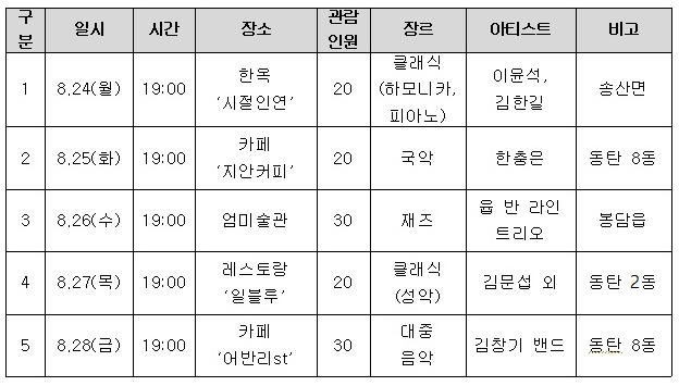 1. 더 에이치 콘서트 The H Concert 8월,장소:한옥 '시절인연'(송산면), 카페 '지안커피'(동탄 8동), 엄미술관(봉담읍), 레스토랑 '일블루'(동탄 2동), 카페 '어반리st'(동탄 8동),기간:2020년 8월 24일~2020년 8월 28일