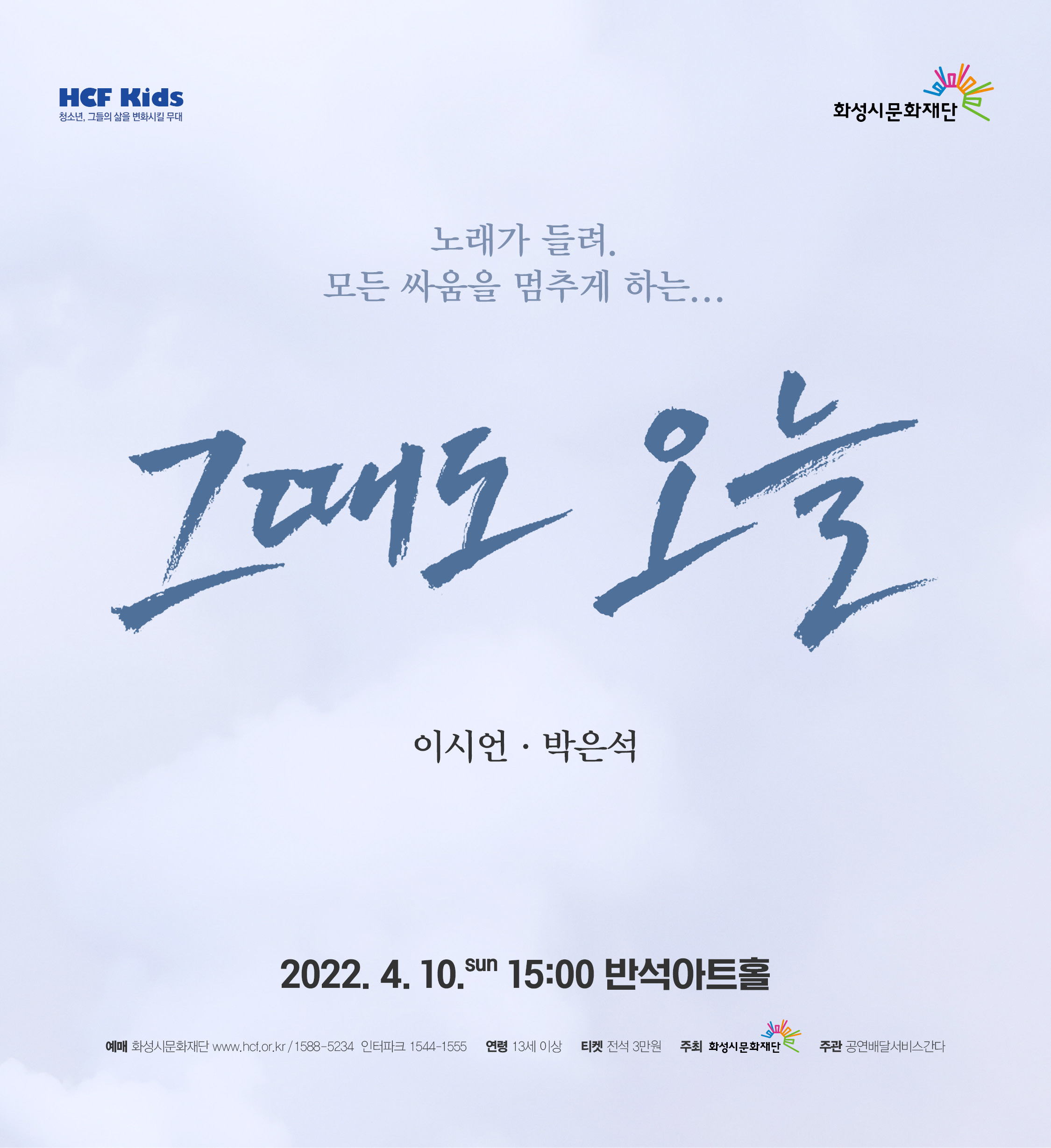 1. HCF Kids - 청소년 : 그때도 오늘,장소:동탄복합문화센터 반석아트홀,기간:2022년 4월 10일~2022년 4월 10일