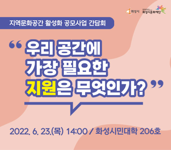 1. 지역문화공간 활성화 공모사업 간담회 <우리 공간에 가장 필요한 지원은 무엇인가?> 6.23(목) 14시,장소:화성시민대학 206호(화성시 봉담읍 효행로 212),기간:2022년 6월 23일~2022년 6월 23일