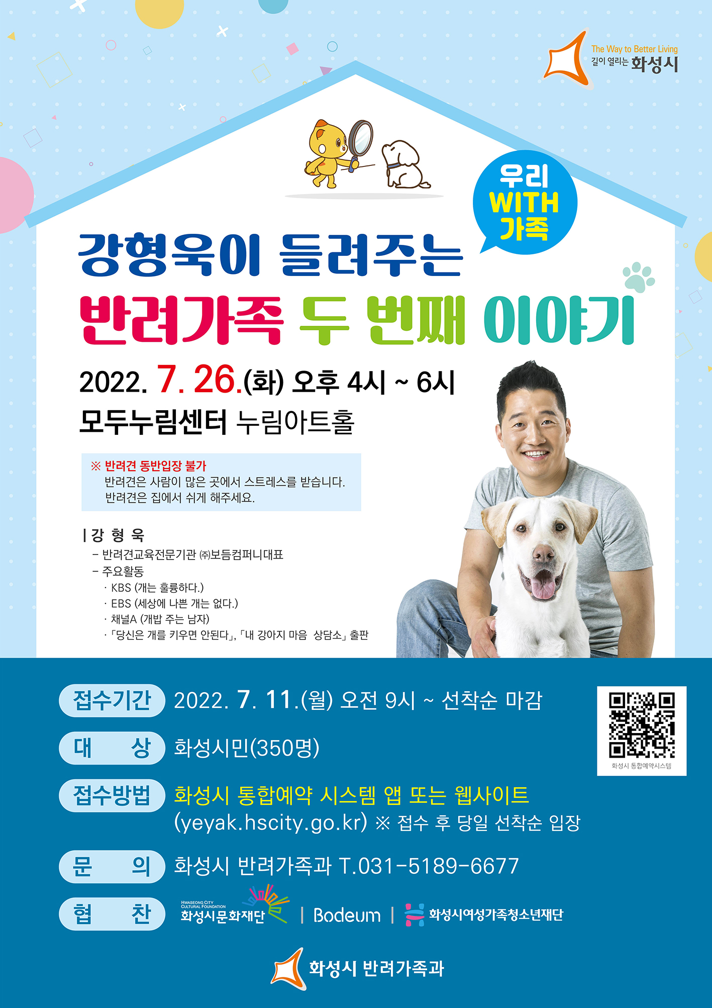 1. 2022년 반려문화 명사특강 "강형욱이 들려주는 반려가족 두 번째 이야기",장소:모두누림센터 누림아트홀,기간:2022년 7월 26일~2022년 7월 26일