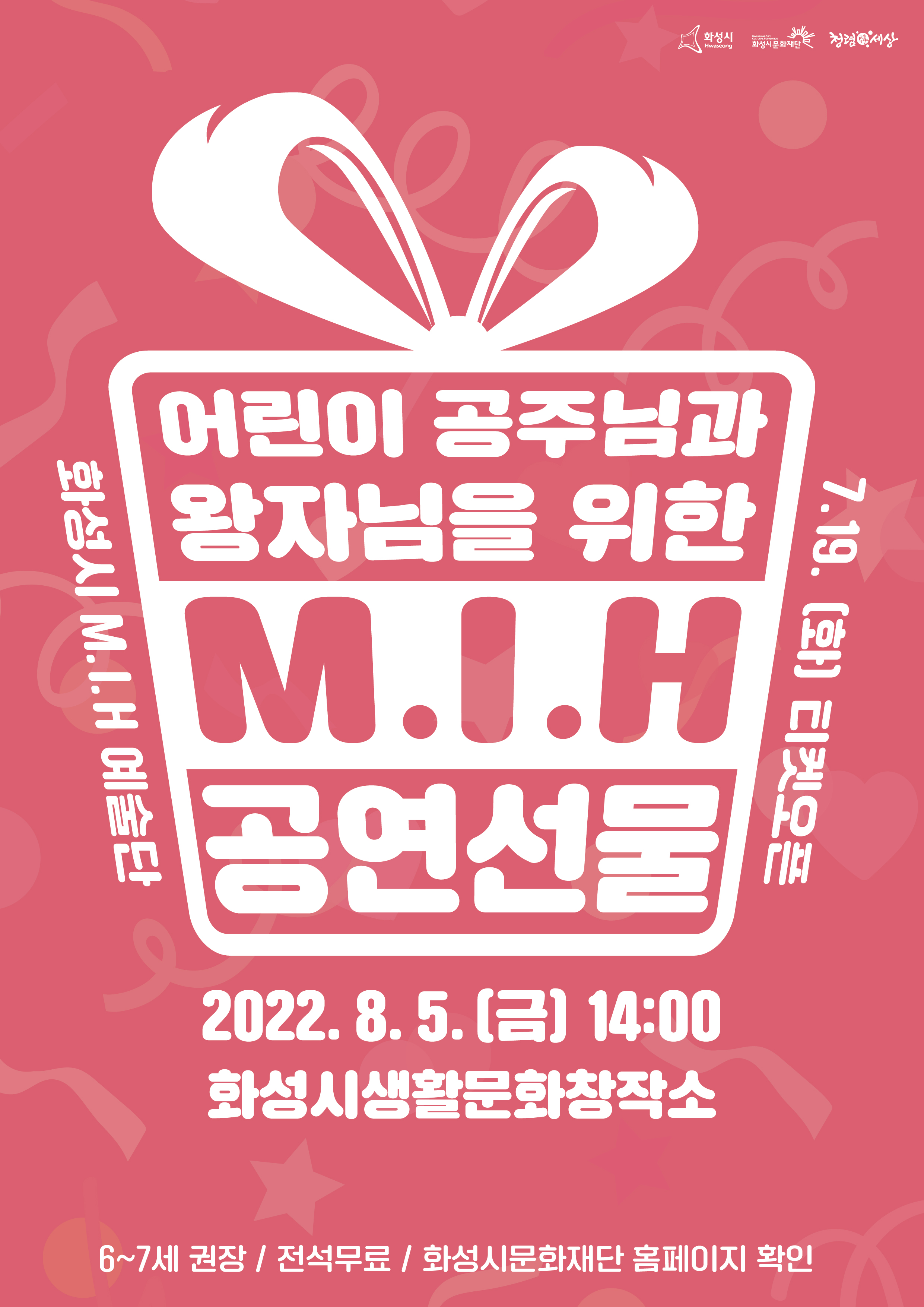1. [화성시 M.I.H 예술단] 어린이 공주님, 왕자님을 위한 M.I.H 공연선물,장소:화성시 생활문화창작소,기간:2022년 8월 5일~2022년 8월 5일