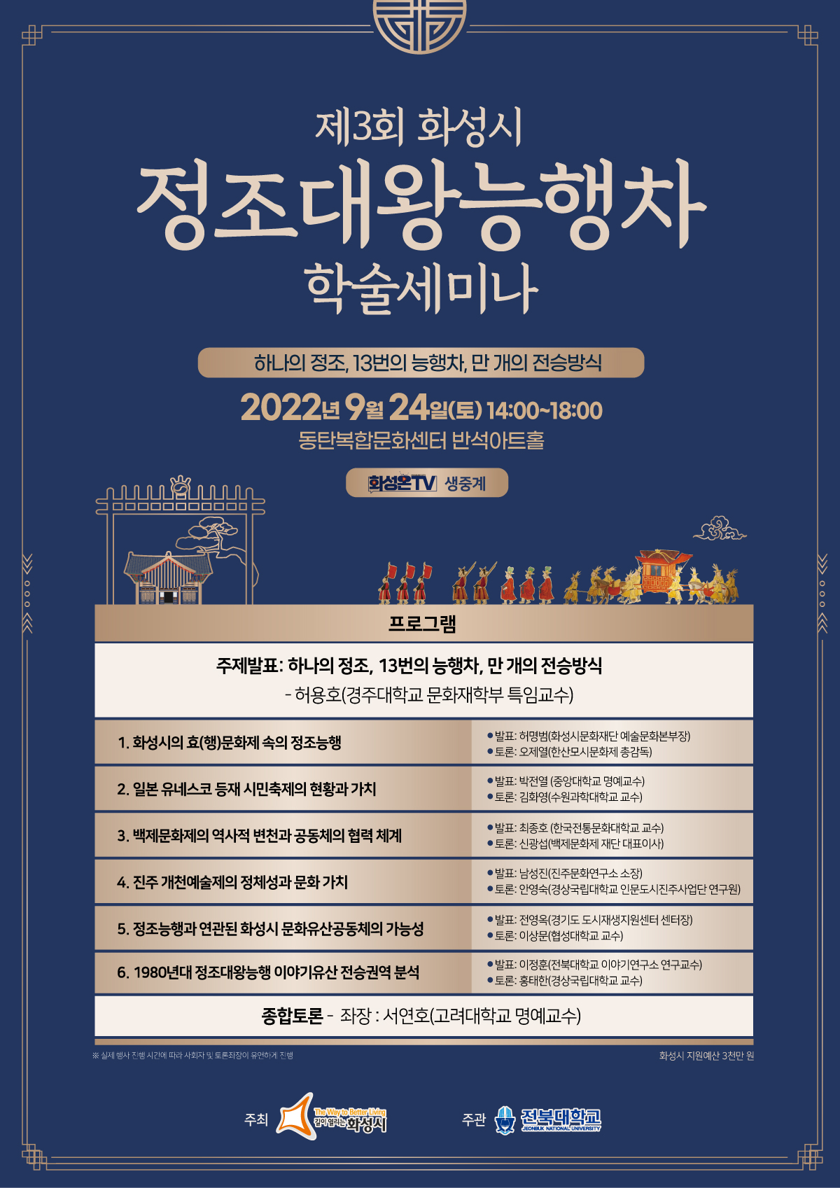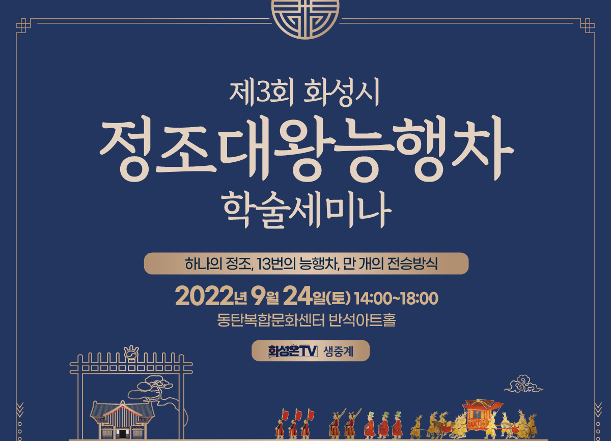 【[공 연]대관공연】제3회 정조대왕능행차 학술세미나 장소 동탄복합문화센터 반석아트홀 기간 2022년 9월 24일 ~ 2022년 9월 24일 요일 토 공연시간 2022년 9월 24일(토) 14:00~18:00 티켓정보 무료 관람등급 전체 관람가 문의 본 행사는 화성시청 문화예술과 주관입니다. 목록이미지_정조.jpg [ Size : 439.72KB, Down : 80 ] 미리보기 다운로드 목록이미지_정조 정조대왕능행차 학술세미나_포스터2_최종.jpg [ Size : 764.47KB, Down : 136 ] 미리보기 다운로드 정조대왕능행차 학술세미나_포스터2_최종 목록보기
