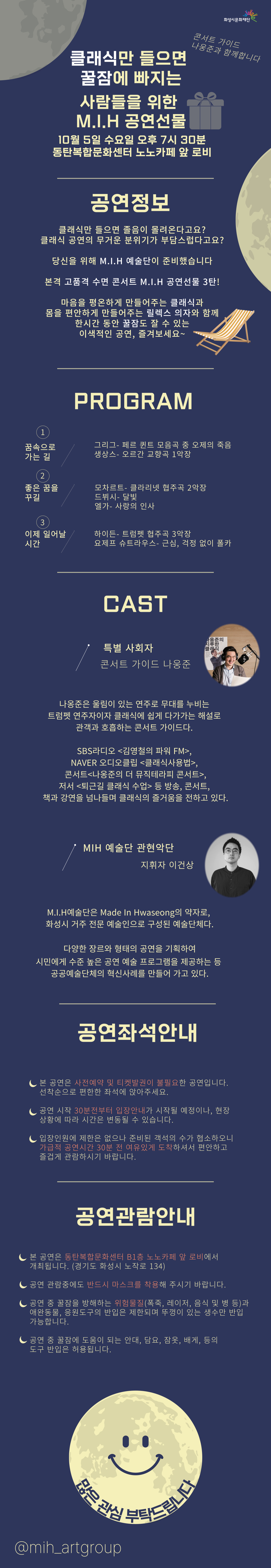 1. [화성시 M.I.H 예술단]클래식만 들으면 꿀잠에 빠지는 사람들을 위한 M.I.H 공연선물 (3탄),장소:동탄복합문화센터 노노카페 앞,기간:2022년 10월 5일~2022년 10월 5일