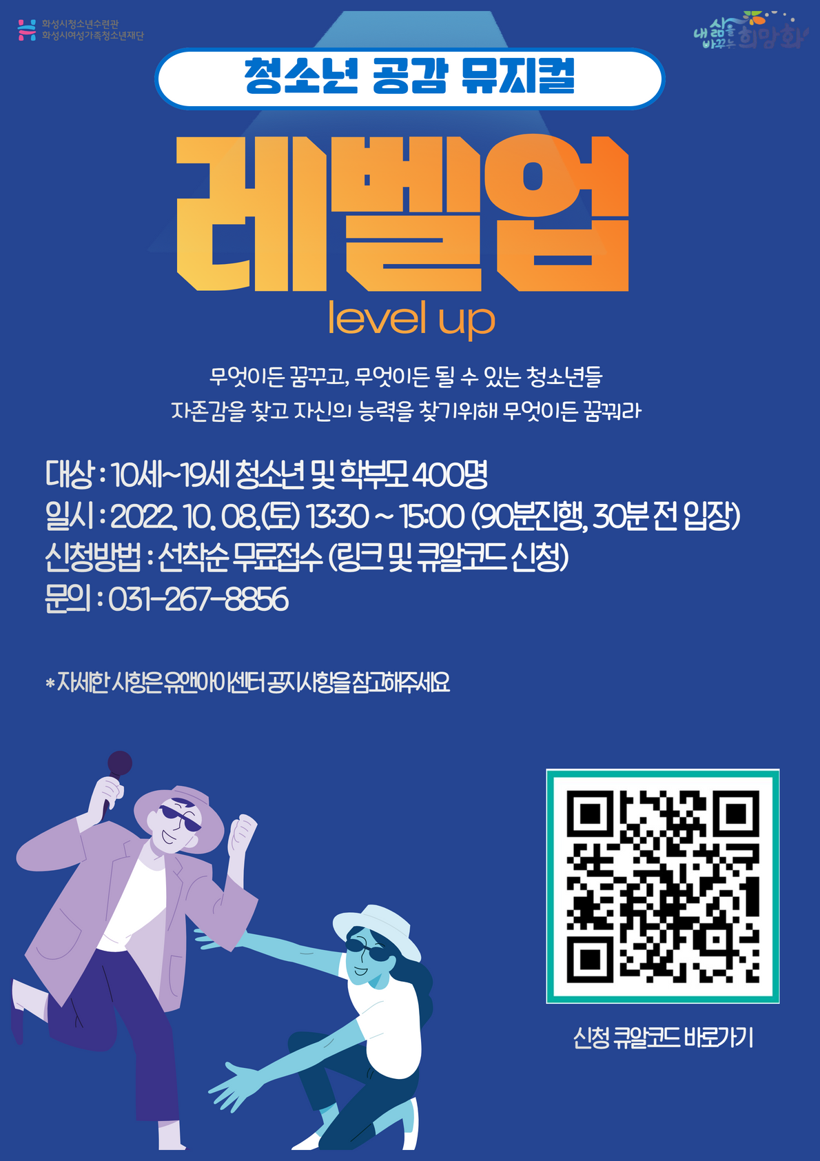 【[공 연]대관공연】 청소년뮤지컬 ‘레벨업’ 장소 유앤아이센터 화성아트홀 기간 2022년 10월 8일 ~ 2022년 10월 8일 요일 토 공연시간 2022년 10월 8일(금) 13:30(소요시간 90분) 티켓정보 무료(선착순 접수, 하단 링크 활용) 관람등급 10세~19세 청소년 및 학부모 (총 400명) 문의 031-267-8856 예약하기https://booking.naver.com/booking/6/bizes/656464 목록 -진로박람회 뮤지컬 포스터.png [ Size : 411.18KB, Down : 95 ] 미리보기 다운로드 목록 -진로박람회 뮤지컬 포스터 진로박람회 뮤지컬 포스터.png [ Size : 632.95KB, Down : 129 ] 미리보기 다운로드 진로박람회 뮤지컬 포스터 공감뮤지컬 레벨업 설명.jpg [ Size : 1.39MB, Down : 116 ] 미리보기 다운로드 공감뮤지컬 레벨업 설명 목록보기