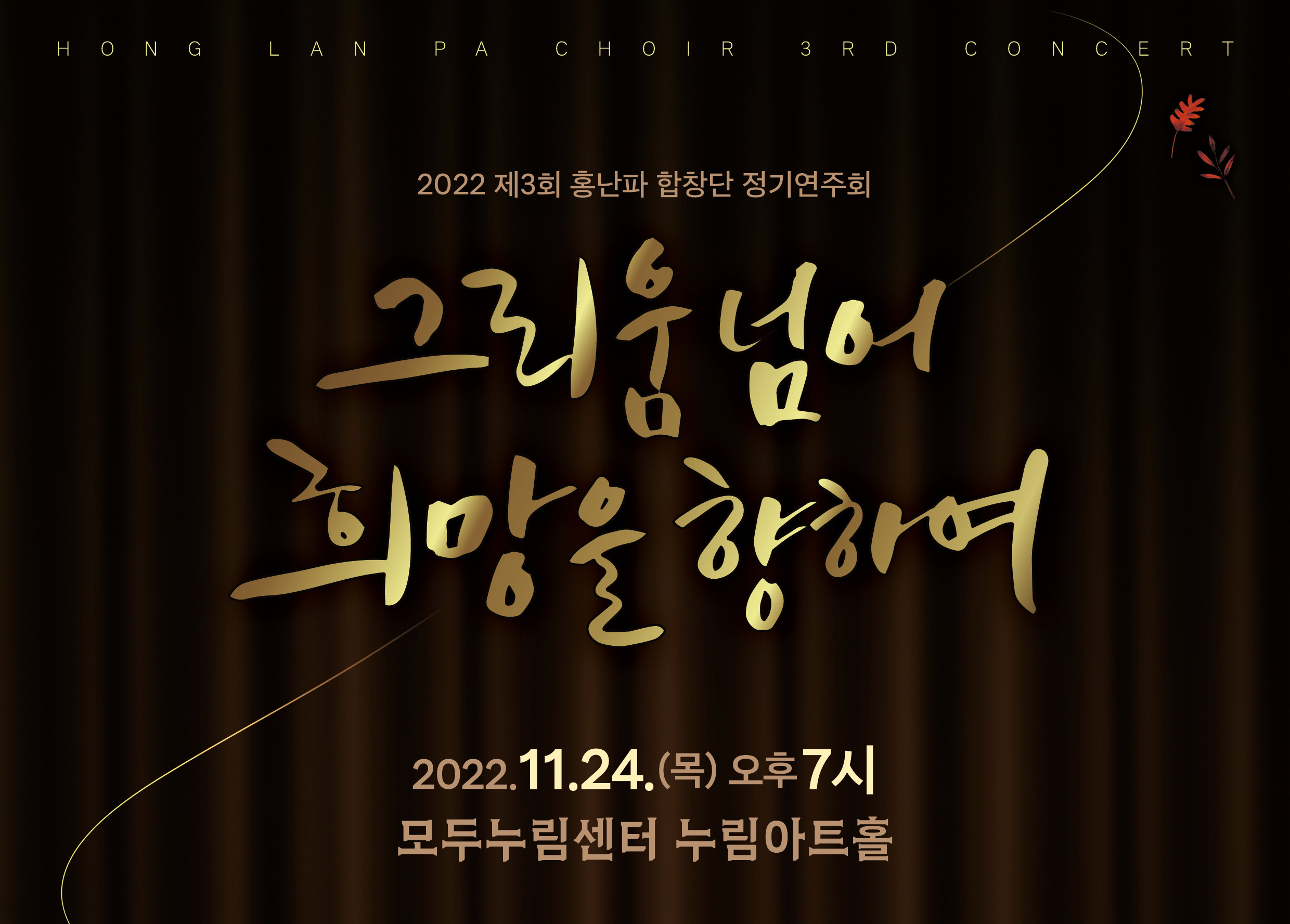 【[공 연]대관공연】제3회 정기 연주회 장소 모두누림센터 누림아트홀 기간 2022년 11월 24일 ~ 2022년 11월 24일 요일 목 공연시간 2022년 11월 24일(목) 19:00 (소요시간 120분) 티켓정보 문의요망 관람등급 7세 이상 문의 031-355-0491, 010-2289-삼사육오 프로그램 목록이미지_홍난파.jpg [ Size : 1.21MB, Down : 75 ] 미리보기 다운로드 목록이미지_홍난파 3회정기연주포스터.jpg [ Size : 3.33MB, Down : 107 ] 미리보기 다운로드 3회정기연주포스터 순서지_홍난파합창단.jpg [ Size : 195.55KB, Down : 239 ] 미리보기 다운로드 순서지_홍난파합창단 목록보기