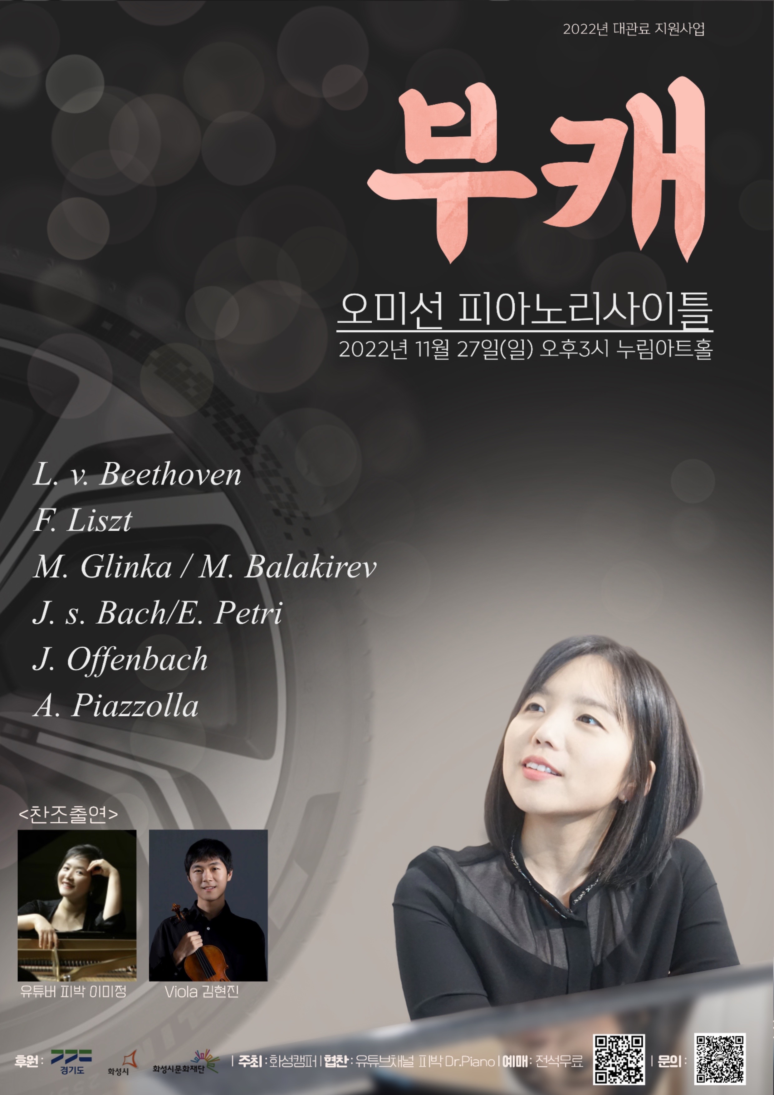 【[공 연]대관공연】오미선 피아노 리사이틀 장소 모두누림센터 누림아트홀 기간 2022년 11월 27일 ~ 2022년 11월 27일 요일 일 공연시간 2022년 11월 27일(일) 15:00 (소요시간 80분) 티켓정보 전석무료 관람등급 초등학생 이상 문의 https://namecard.kakao.com/ohdame 문의 카카오톡 https://namecard.kakao.com/ohdame 오미선 포스터.jpeg [ Size : 763.35KB, Down : 68 ] 미리보기 다운로드 오미선 포스터 오미선 포스터.jpeg [ Size : 763.35KB, Down : 67 ] 미리보기 다운로드 오미선 포스터 오미선 프로그램.jpeg [ Size : 63.3KB, Down : 315 ] 미리보기 다운로드 오미선 프로그램 목록보기