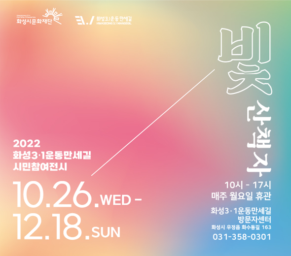 1. 화성3.1운동만세길 방문자센터 시민참여전시<빛 산책자>,장소:화성3·1운동만세길 방문자센터 (화성시 우정읍 화수동길 163),기간:2022년 10월 26일~2022년 12월 18일