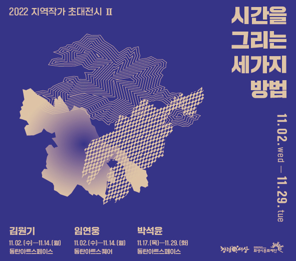 <시간을 그리는 세가지 방법>은 세 작가의 최근작을 중심으로 그들의 전반적인 작품세계를 보여주고자 합니다. 전시된 작품들은 작가 각각이 가진 인생의 흔적입니다. 직업적 경험, 관심, 도전 과 같은 시간들이 재료가 되어 작품을 완성합니다. 세 작가의 작품 안에는 어떤 시간들이 재료로 사용 되었을까요? 전시를 관람하시며 작품 안에 담긴 세 작가의 시간 재료를 찾아보시기 바랍니다. 이번 전시는 1부와 2부로 나누어 운영됩니다. 11월 2일부터 11월 14일까지 진행되는 1부는 김원기, 임연웅 작가의 작품이 동탄아트스페이스와 동탄아트스퀘어에 전시됩니다. 11월 17일부터 11월 29일까지 진행되는 2부는 동탄아트스페이스에서 박석윤 작가의 작품을 보여줍니다.
