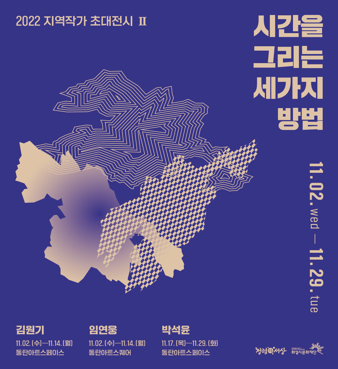 화성시문화재단은 화성시에서 꾸준하고 활발하게 활동하는 예술가들을 지원하기 위해 <시간을 그리는 세가지 방법>을 선보입니다. 이번 전시는 화성시 지역 예술의 다양성과 발전을 보여주기 위해 김원기(1955~), 임연웅(1956~), 박석윤(1960~) 작가를 조명합니다.