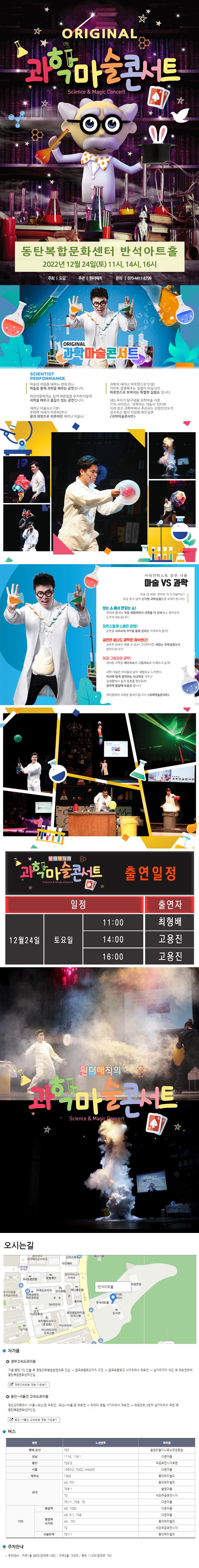 1. 과학마술 콘서트,장소:동탄복합문화센터 반석아트홀,기간:2022년 12월 24일~2022년 12월 24일