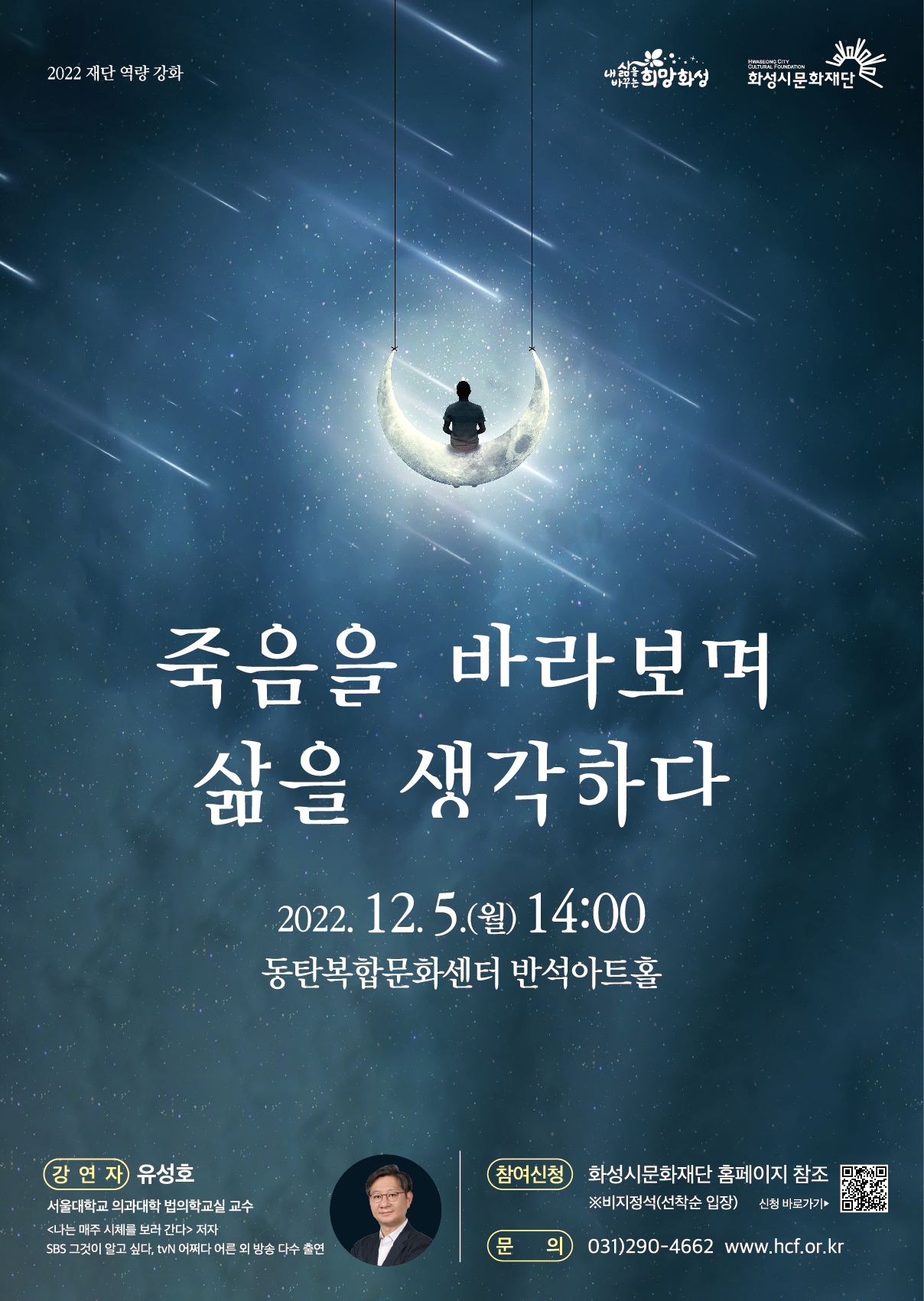 2022 재단역량강화 죽음을 바라보며 삶을 생각하다 2022.12.5(월) 14:00 동탄복합문화센터 반석아트홀/ 강연자:유성호 (서울대학교 의과대학 법의학실 교수, 나는 매주 시체를 보러간다 저자, SBS그것이알고싶다, tvN어쩌다어른 외 방송 다수 출연)/ 참여신청:화성시문화재단 홈페이지참조(비지정석, 선착순입장)/ 문의:031-290-4662 www.hcf.or.kr