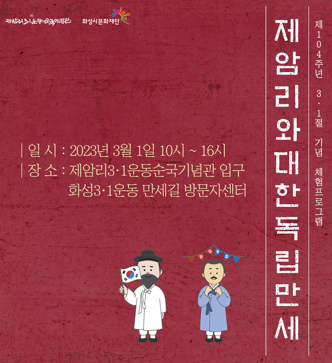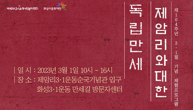 1. 제암리와 대한독립만세,장소:제암리3.1운동순국기념관 입구, 화성3.1운동만세길 방문자센터,기간:2023년 3월 1일~2023년 3월 1일