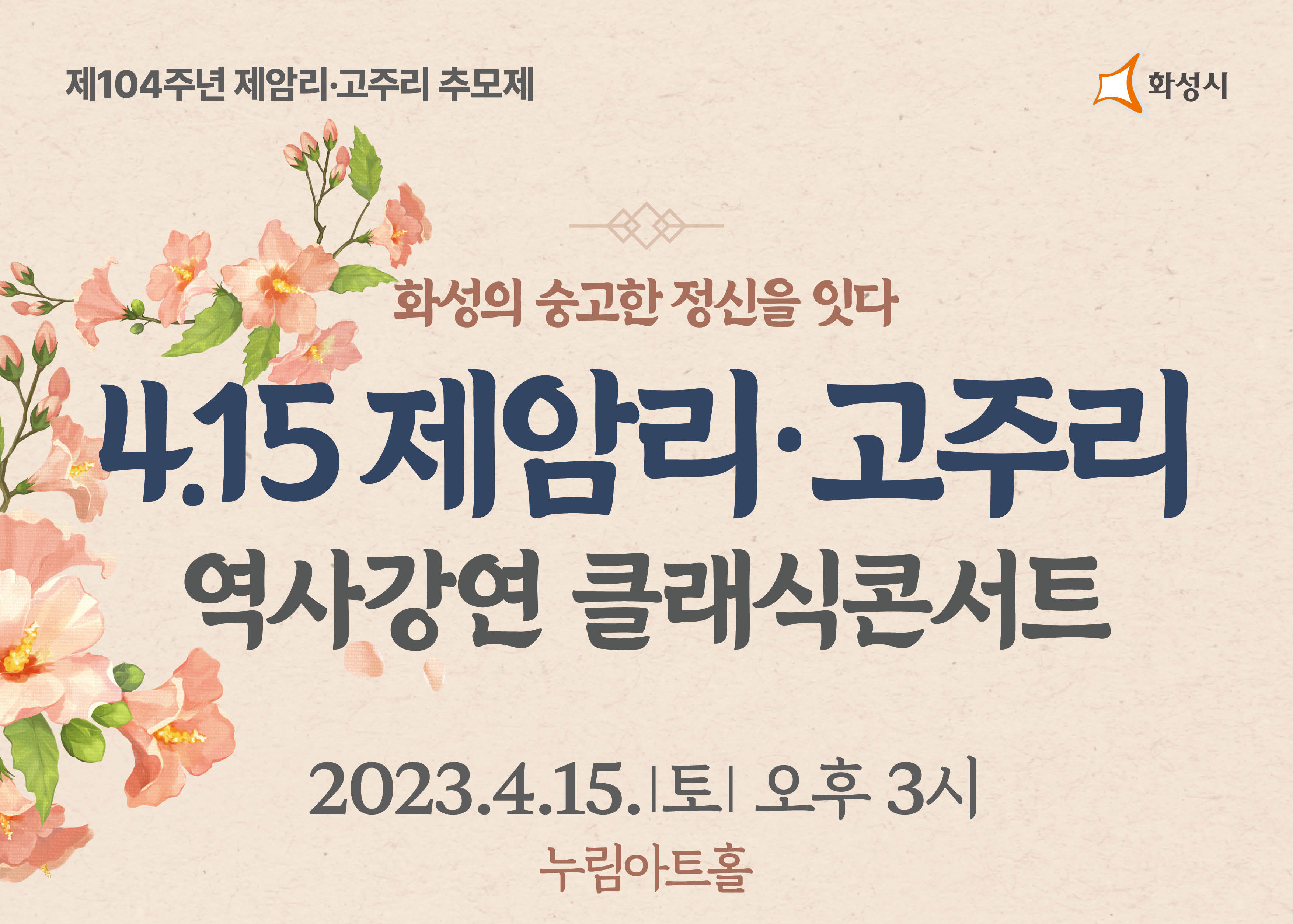 1. 제104주년 4.15 제암리·고주리 역사강연 클래식콘서트,장소:모두누림센터 누림아트홀,기간:2023년 4월 15일~2023년 4월 15일