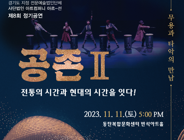 【[공 연]대관공연】공존 Ⅱ - 전통의 시간과 현대의 시간을 잇다! : 무용과 타악의 만남 장소 동탄복합문화센터 반석아트 기간 2023년 11월 11일 ~ 2023년 11월 11일 요일 토 공연시간 17:00 / 100분 (인터미션없음) 티켓정보 관람등급 6세이상 입장가능 문의 010 2949 **** . 20231026_175112.png [ Size : 458.6KB, Down : 954 ] 미리보기 다운로드 20231026_175112 포스터.jpg [ Size : 2.98MB, Down : 1,187 ] 미리보기 다운로드 포스터 목록보기