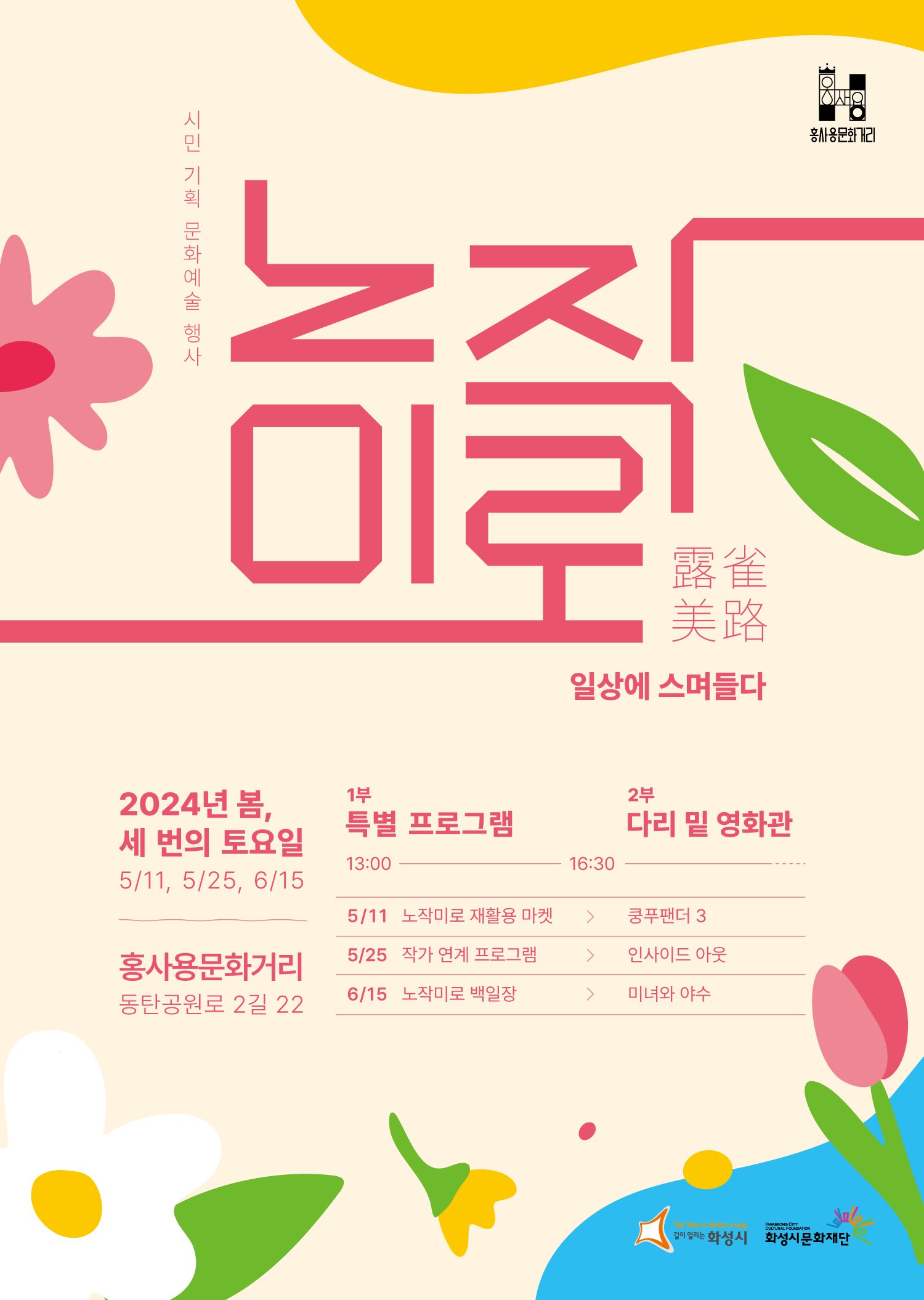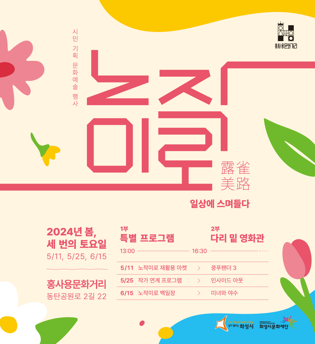 1. 홍사용 문화거리 시민기획행사 <노작미로, 일상에 스며들다> [1부 작가연계프로그램/2부 다리밑영화관],장소:홍사용 문화거리(동탄공원로2길 22/화성시미디어센터 앞 다리 밑 행사장),기간:2024년 5월 25일~2024년 5월 25일