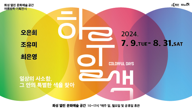 1. 화성 열린 문화예술 공간 여름방학 기획전시<하루일색 : Colorful days>,장소:화성시 동탄대로 5길 21, 라크몽 B동 3층, 화성 열린 문화예술 공간,기간:2024년 7월 9일~2024년 8월 31일