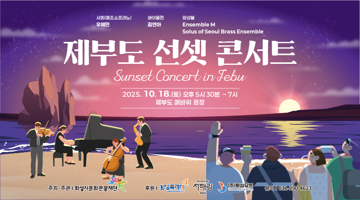사회(메조소프라노) 우혜민 바이올린 김연아 앙상블 Ensemble M Solus of Seoul Brass Ensemble 제부도 선셋 콘서트 Sunset Concert in Jebu 2025.10.18.(토)오후 5시 30분 ~ 7시제부도 매바위 광장주최주관 | 화성시문화관광재단 후원 | 화성특례시 서해랑 (주)화성요트 문의 | 031-290-4623