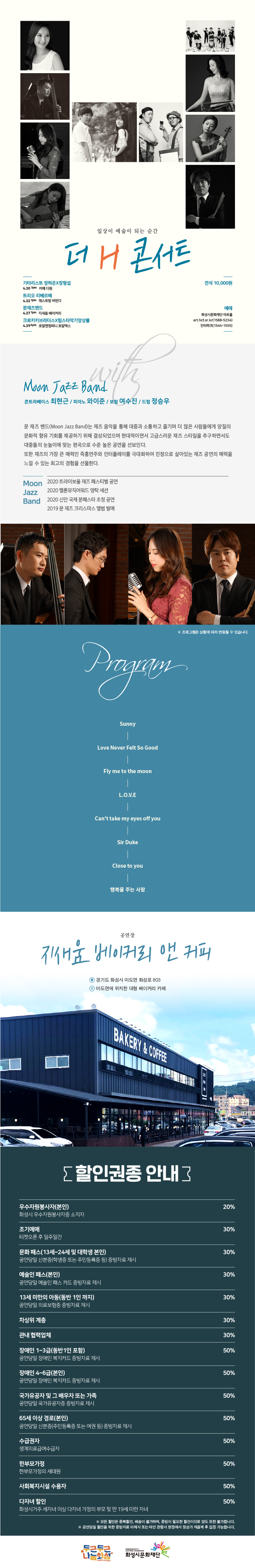 1. 더 H 콘서트 '문 재즈 밴드',장소:지새움 베이커리(경기도 화성시 마도면 화성로 803),기간:2021년 4월 27일~2021년 4월 27일