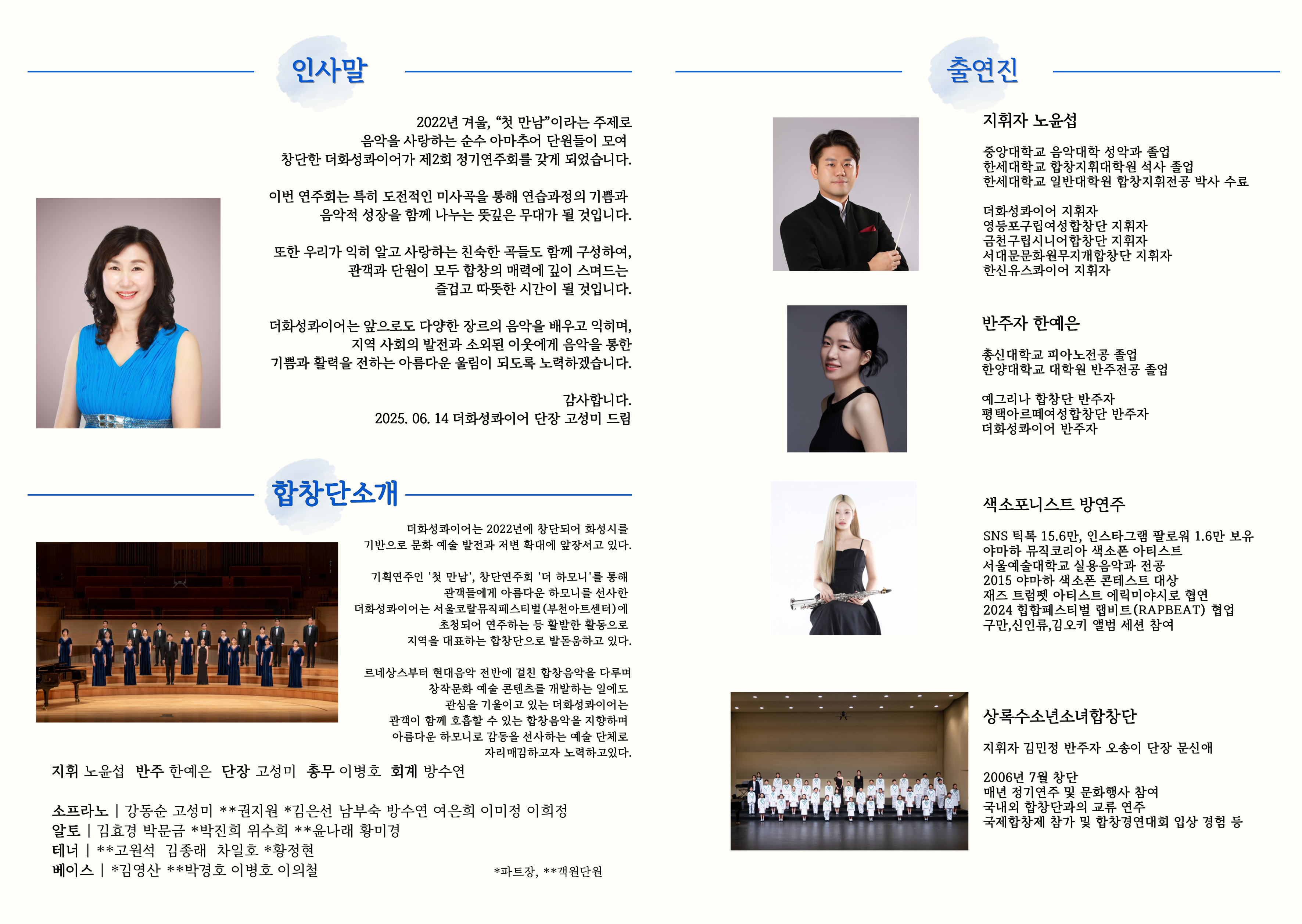 2022년 겨울 첫 만남이라는 주제로 음악을 사랑하는 순수 아마추어 단원들이 모여 창단한 대화성콰이어가 제2회 정기연주회를 갖게 되었습니다. 이번 연주회는 특히 도전적인 미사곡을 통해 연습과정의 기쁨과 음악적 성장을 함께 나누는 뜻깊은 무대가 될 것입니다. 또한 우리가 익히 알고 친숙한 곡들도 구성하여 관객과 단원이 모두 합창의 매력에 깊이 스며드는 즐겁고 따뜻한 시간이 더화성콰이어는 앞으로도 다양한 장르의 배우고 익히며 지역 사회의 발전과 소외된 이웃에게 통한 활력을 전하는 아름다운 울림이 되도록 노력하겠습니다. 감사합니다.