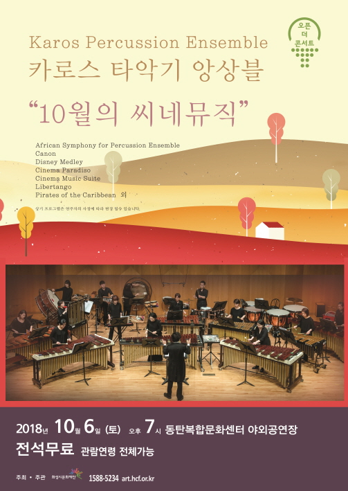 1.  오픈 더 콘서트 카로스 타악기 앙상블 `10월의 씨네뮤직`,장소:동탄복합문화센터 야외 공연장,기간:2018년 10월 6일~2018년 10월 6일
